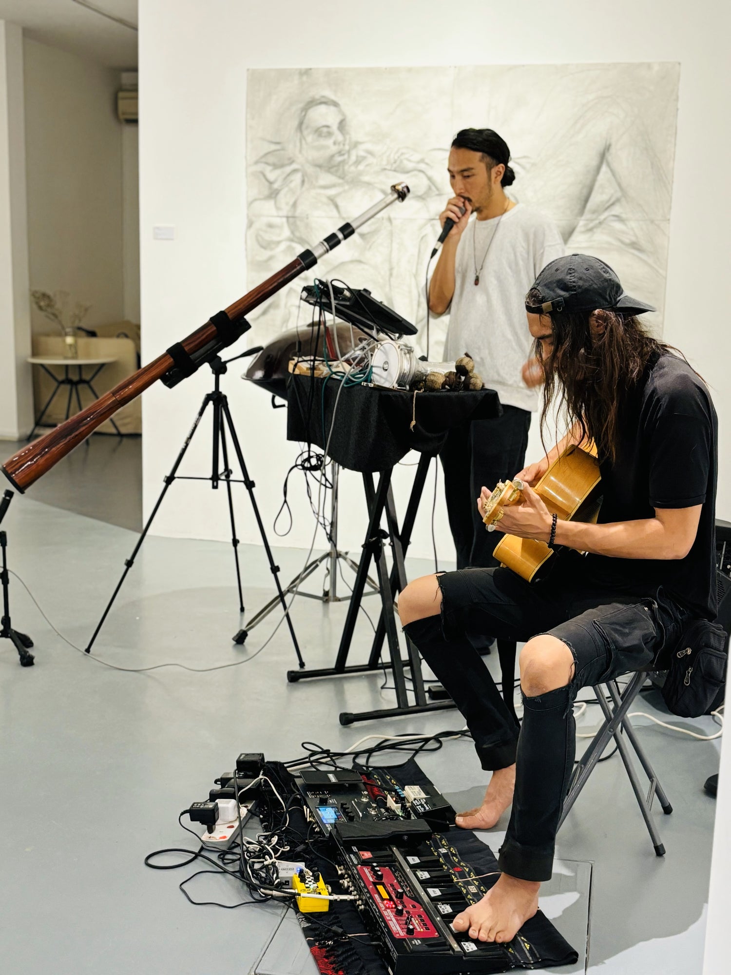 Max (in white), a talented artist from Japan expertly plays the didgeridoo and handpan. The didgeridoo, a traditional Aboriginal Australian wind instrument, produces deep, resonant drone sounds that add a rich, earthy quality to his music. The handpan, a modern percussion instrument, offers soothing, melodic tones, perfect for creating a meditative atmosphere. Cruise (in black), a skilled musician from Singapore who excels in playing the acoustic guitar. Cruise's use of an intricate pedalboard setup allows him to blend various effects, adding depth and texture to his music.
