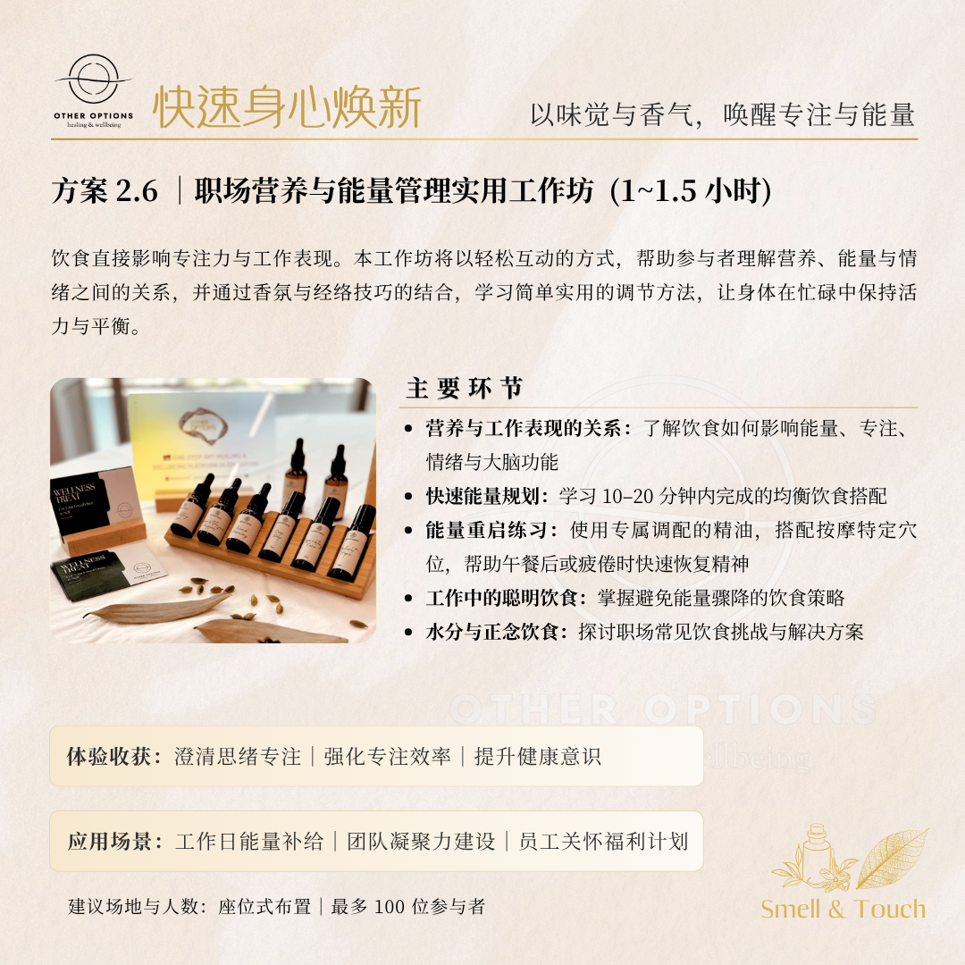 - Hands-on practice for energy reset: Apply a specially prepared essential oil and massage certain acupressure points to recharge after lunch or when fatigue kicks in