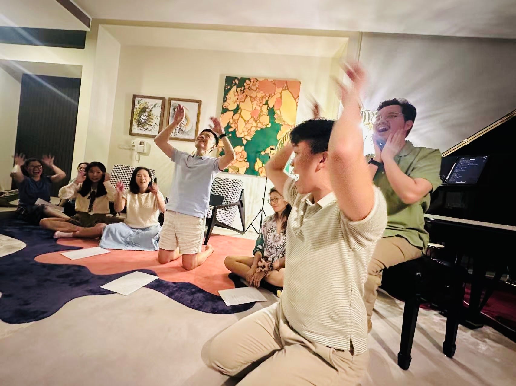 Collective singing followed by gentle reflection, fostering resonance and meaningful connection.
